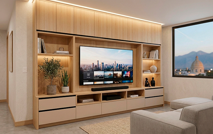 Centros de entretenimiento, repisas y vitrinas adaptadas a tus necesidades.
